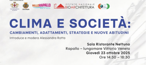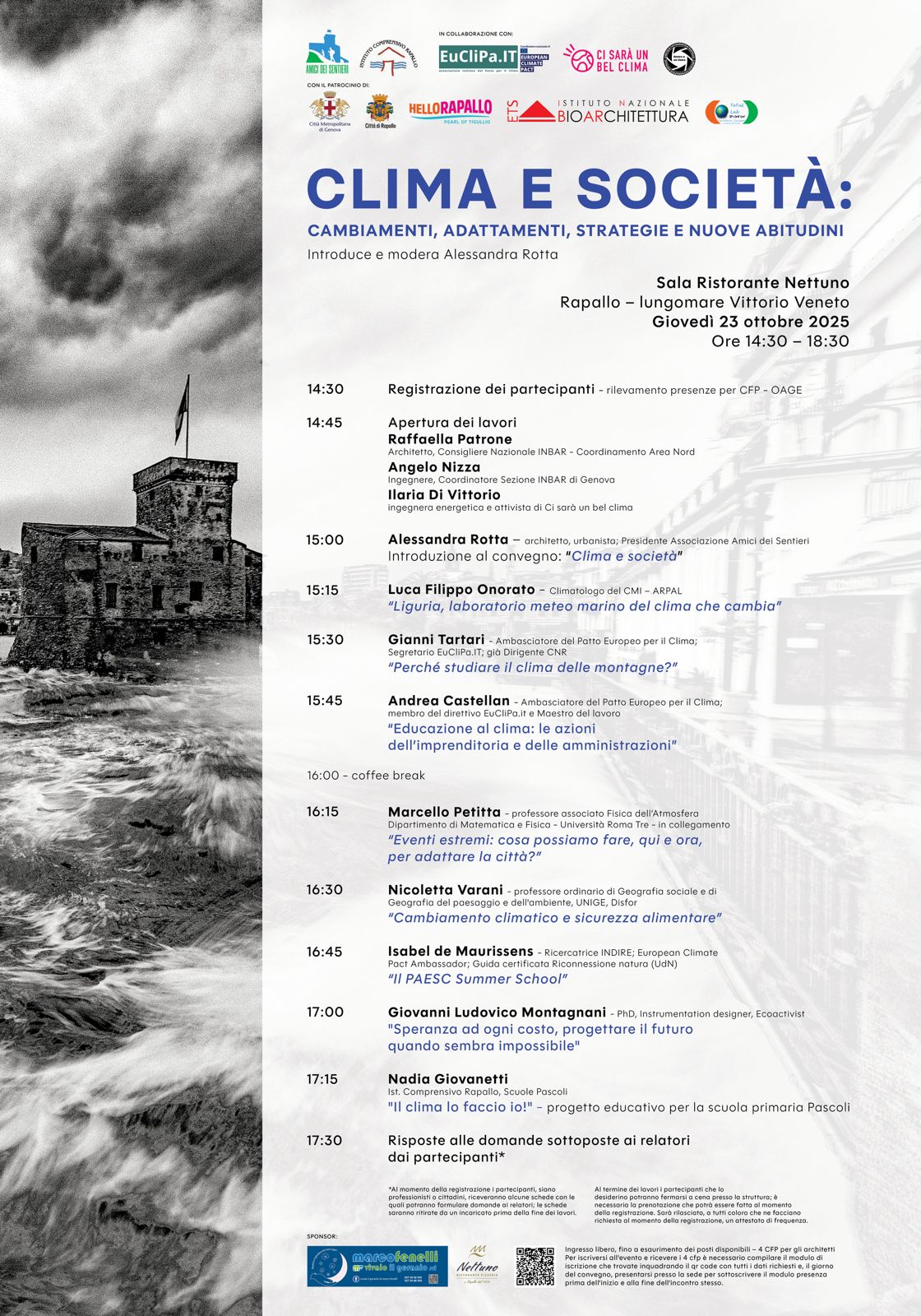 In occasione della Giornata europea all'educazione per il clima, Il 23 ottobre 2025 dalle 14:30 alle 18:30 presso la Sala Ristorante Nettuno, lungomare Vittorio Veneto, Rapallo, si terrà il Convegno nazionale dal titolo “Clima e società: cambiamenti, adattamenti, strategie e nuove abitudini”. I relatori saranno: Andrea Castellan, EuClipa.it; Isabel De Maurissens, ricercatrice INDIRE; Nadia Giovannetti, Ist. Comprensivo Rapallo, Scuole Pascoli; Giovanni Montagnani, Ci sarà un bel clima; Luca Onorato, Arpal; Marcello Petitta, Università Roma Tre; Gianni Tartari, EuClipa.it; Nicoletta Varani, Università di Genova, DISFOR.